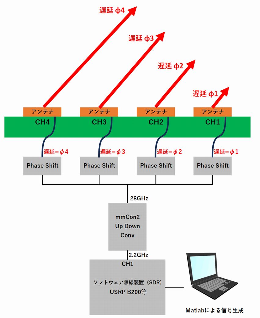 IF信号の周波数を上変換(アップコンバート)して得たRF信号を4つに分岐させ,個別の位相シフト回路(Phase shifter)を介して各エレメントに給電します.