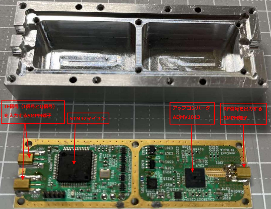 IF I/Q信号を入力するSMPM端子,STM32F446マイコン(STマイクロエレクトロニクス),24G-44GHzワイドバンド・マイクロウェーブ・アップコンバータ ADMV1013(図7),RF出力のSMPM端子が並んでいます.