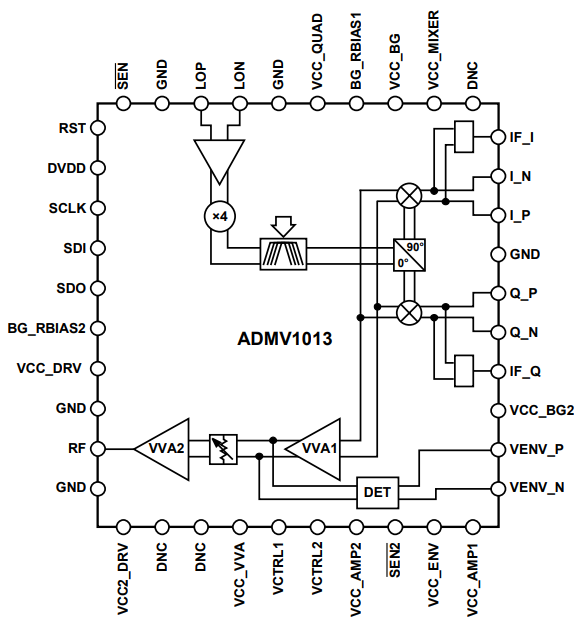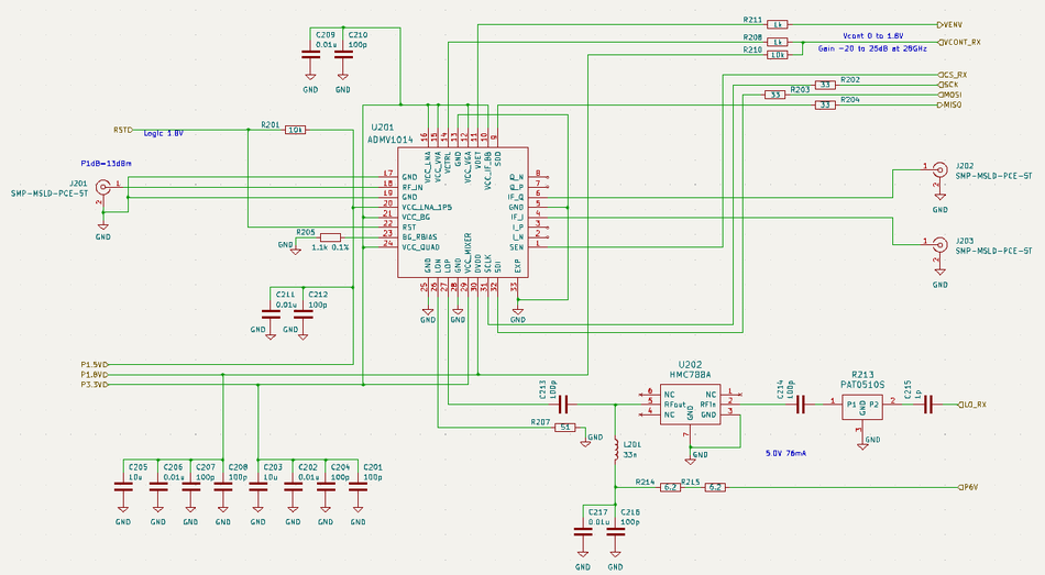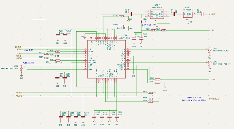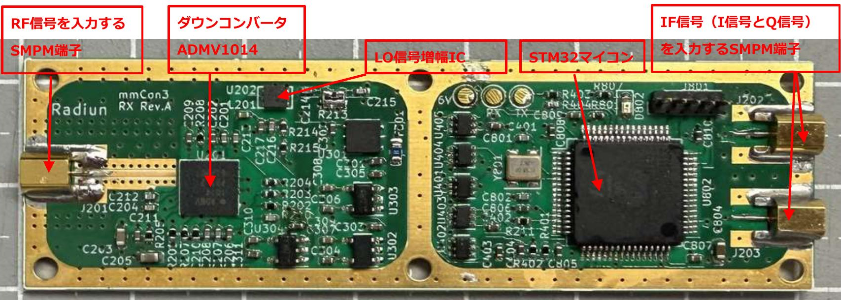 図9に基板の外観を示します.左からRF入力のSMPM端子,44G-24GHzワイドバンド・マイクロウェーブ・ダウンコンバータ ADMV1014(図10),STM32F446マイコン(STマイクロエレクトロニクス),IFのI/Q出力のSMPM端子です.左上のチップ(U202)は,ストリップ線路による共振回路で受信したLO信号を増幅しています.