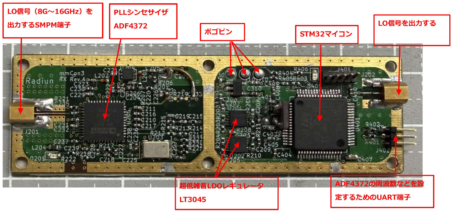 HIバンド(8G~16GHz)のLO信号を出力するSMPM端子,VCO内蔵マイクロ波広帯域シンセサイザ(図13),超低雑音LDOレギュレータ LT3045,STM32F446マイコン(STマイクロエレクトロニクス),LOバンド(4G~8GHz)のLO信号を出力するSMPM端子を実装しました.