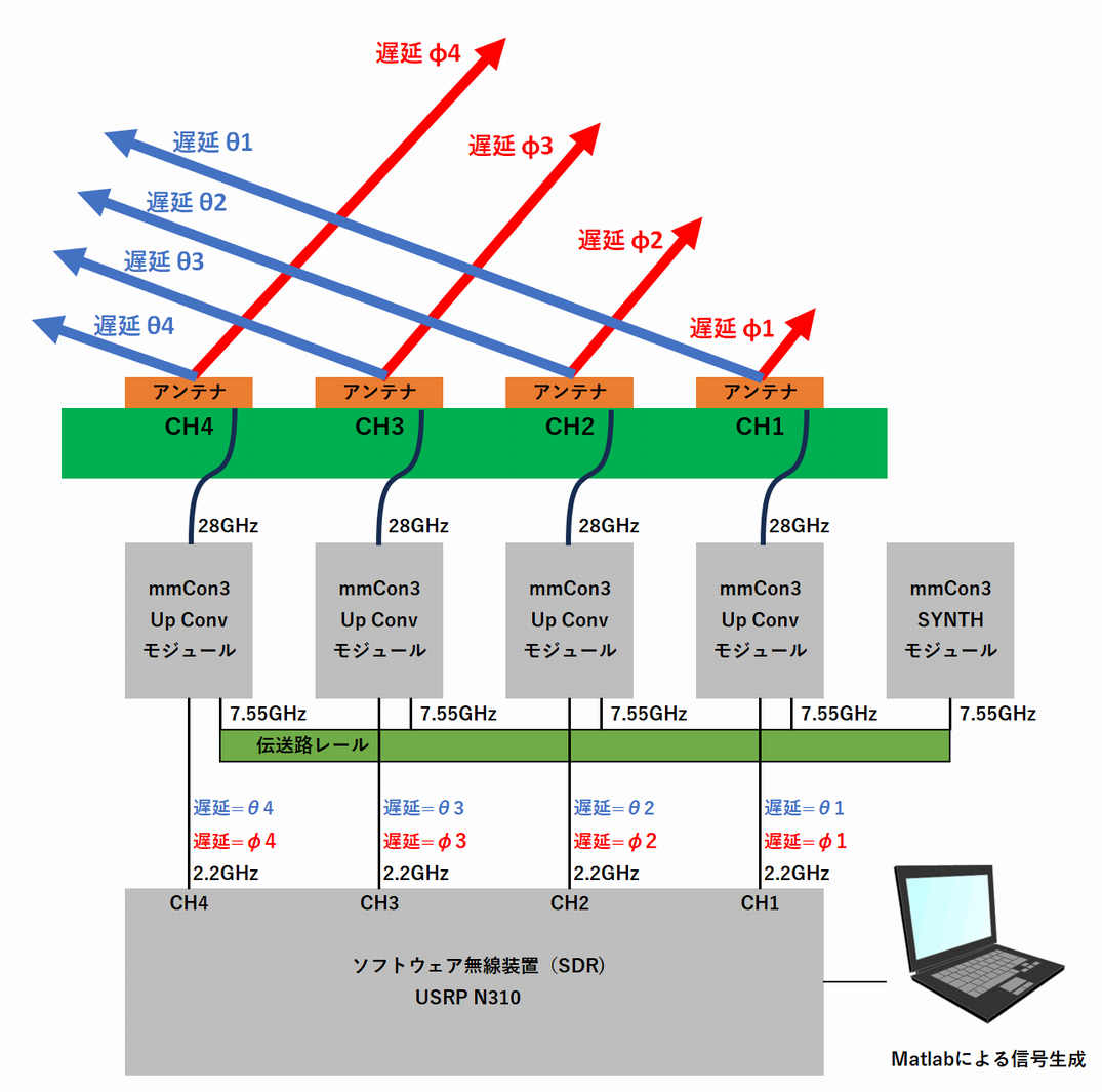 $\theta_1$~$\theta_4$と$\Phi_1$~$\Phi_4$を自由に設定できます.$\theta$の信号と$\Phi$の信号の各変調波ビームが,異なる方向に発射できます.