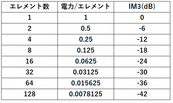 同じ電力なら,同じパワー・アンプでも,1エレメントに比べて,128エレメントでは,$IM_3$が42dBも改善されます.この効果は,フェーズドアレイ・システムに共通しています.パワー・アンプが,エレメントで独立していれば,同じ効果が期待できます.