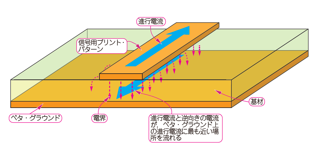 一方,ベタ・グラウンドは面状になっているため,電界が緩やかに分布します.そのため,進行電流の直下の一定の範囲に広がります.基材(誘電体)が薄ければ,電界は狭い範囲に収まるため,リターン電流も狭い範囲を流れます.
