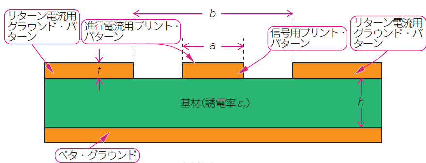 この問題を解決できるのが,図9に示す伝送路の近傍をベタ・グラウンドで挟む「コプレーナ線路」です.グラウンドがプリント基板の表層にあるので,ビアの影響を小さくできます.内層グラウンドにもリターン電流を流す構造のものや,内層グラウンドは設けない構造のものがあります.