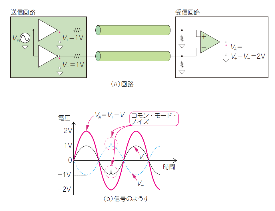 | 図4 差動伝送路は極性が$180^{\circ}$違う2つの信号で駆動し,その差分を受信回路で取り出す |