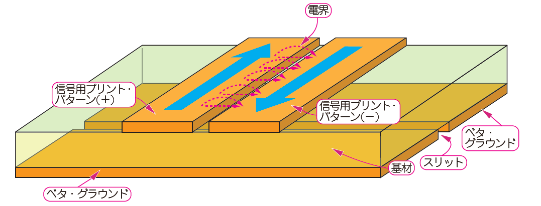 差動伝送路は,進行電流用の線路と同じ信号層にリターン電流専用の線路を追加して,進行電流用の線路に寄り沿わせた構造をしています.この伝送線路なら,リターン電流がベタ・グラウンドに流れなくなります.