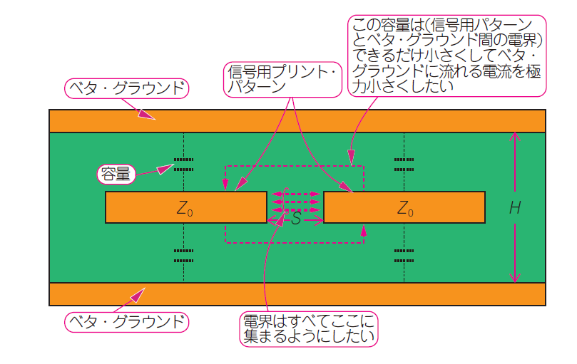誘電体の厚み($H$)を2本の線路の間隙($S$)より大きくするほど,ベタ・グラウンドにまったく電流が流れない純粋な差動伝送路に近づきます.