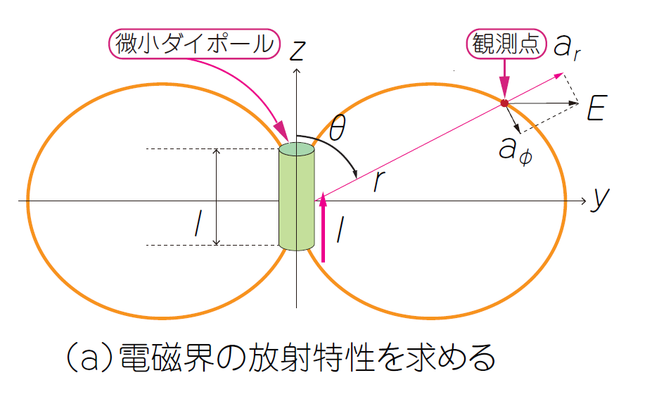 \begin{eqnarray} E&=&-\frac{j\xi Il}{2\pi k} \left( \frac{jk}{r^2}+\frac{1}{r^3}\right) e^{-jkr} a_r\cos\theta+\frac{j\xi Il}{4\pi k}\left( \frac{k^2}{r}-\frac{jk}{r^2}-\frac{1}{r^3}\right) e^{-jkr}a_\theta\sin\theta\\ H&=&\frac{1}{4\pi} \left( \frac{jk}{r} + \frac{1}{r^2} \right) e^{-jkr} a_\phi \sin \theta \end{eqnarray}ただし,$E$:観測点の電界,$H$:観測点の磁界,$I$:微小ダイポール・アンテナに流れる電流,$l$:微小ダイポール・アンテナの長さ,$r$:微小ダイポール・アンテ ナから観測点までの距離,$\theta$:微小ダイポール・アンテナと観測点を結ぶベクトルの$z$軸に対する角度,$a_\phi$:磁界の単位ベクトル,$a_r$:$r$方向の電界の単位ベクトル,$a_\theta$:$\theta$方向の電界の単位ベクトル,$c$:光速,$\lambda$:波長($=c/f$),$\xi$:波動インピーダンス($=120\pi$),$k$:定数($=2\pi/\lambda$)とします.