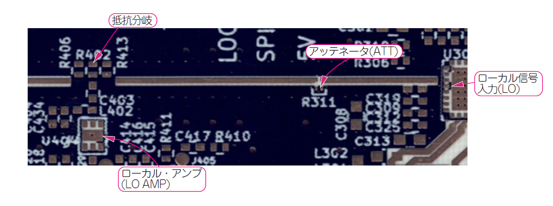 図Gに示すのは,アンプ(LO AMP)から抵抗分岐を経て,ミリ波ダウン・コンバータIC(ADMV1014)に至る$6.8\mathrm{G}~10.75\mathrm{GHz}$のローカル信号が伝える線路です.ADMV1014のローカル入力(LO)の反射特性が良くないため,アッテネータ(ATT)を挿入して,その影響を抑えています.