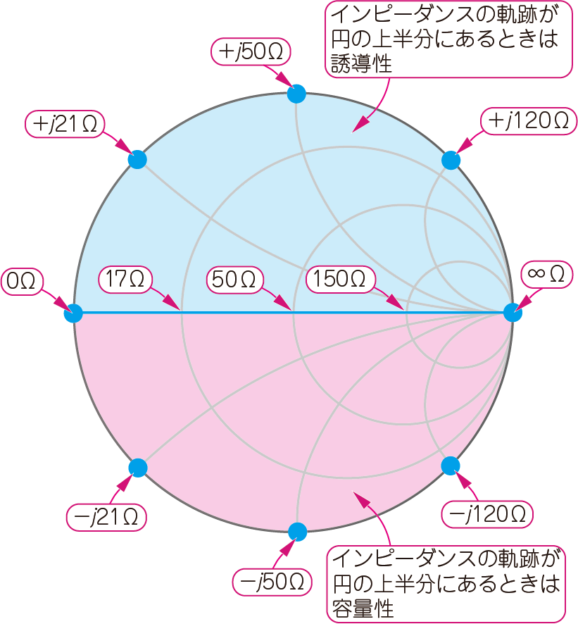 | 図10 スミス・チャート上のプロットの位置から,そのインピーダンスが抵抗性なのか容量性なのか誘導性なのかが一目でわかる |