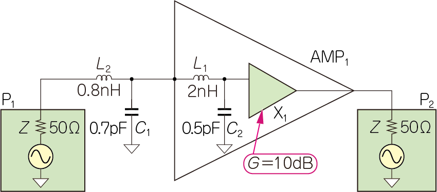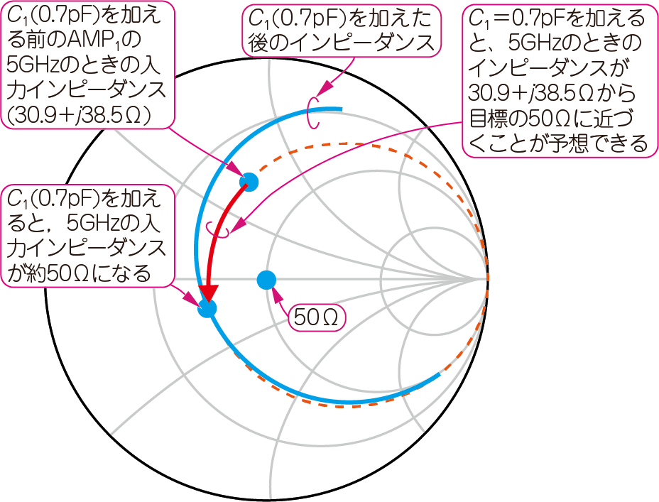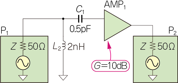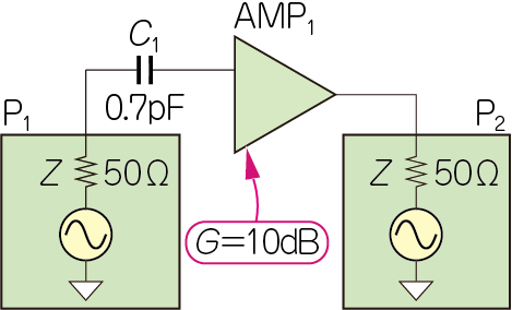 | 図4 高周波回路設計への第一歩 その③:$\mathrm{AMP}_1$の入力に$C_1=0.7\mathrm{pF}$を直列に挿入 |