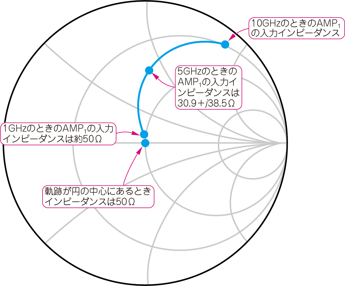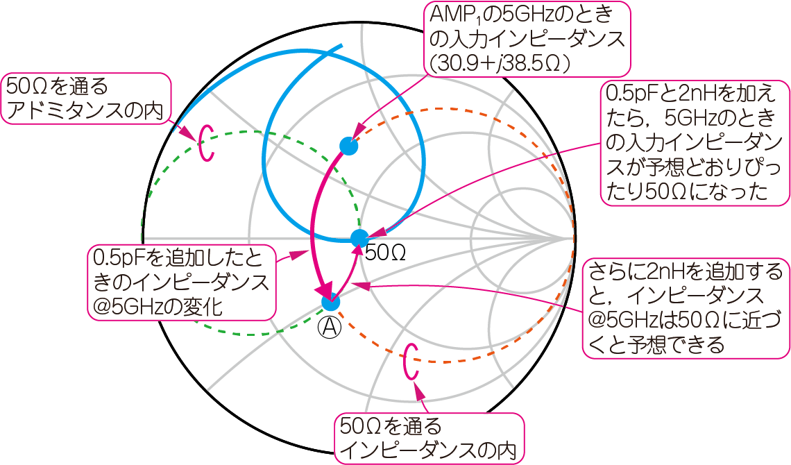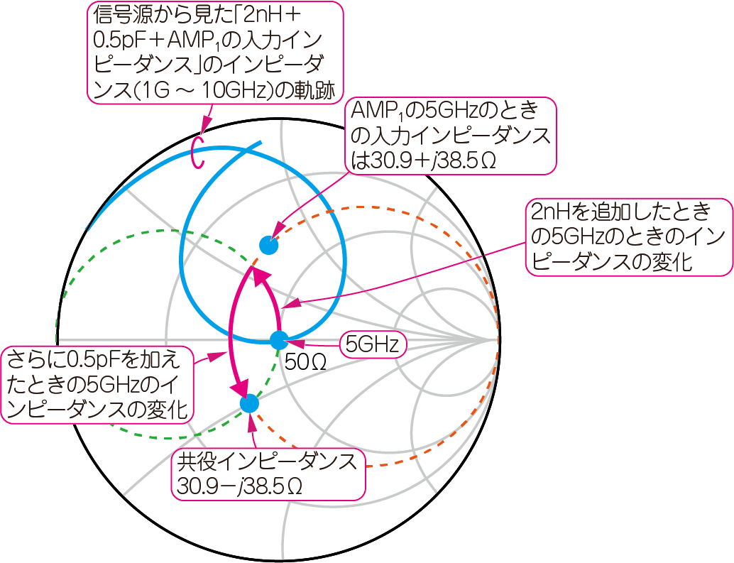 スミス・チャートを使って,図2~図6のコンデンサやインダクタを追加する前後のインピーダンスの周波数変化を調べると,ゲインが$5\mathrm{GHz}$で最大になった過程や理由が見えてきます.