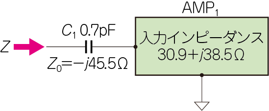 \begin{align} Z_C&=\frac{1}{j2\pi f_C}\\ &=\frac{1}{j2\pi \times 5 \times \ 10^9 \times 0.5 \times 10 ^{-12}}\\ &=-j63.7\\ Z_L&=j2 \pi \times 5 \times 10^9 \times 0.5 \times 10^{-12}\\ &=j62.8 \end{align}$\mathrm{AMP}_1$の入力インピーダンスに,コンデンサを追加したときのインピーダンス$Z_1$と,さらにインダクタを追加したときのインピーダンス $Z_2$は次のとおりです.