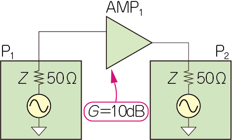 $\mathrm{X}_1$は理想アンプです.理想アンプの入力インピーダンスと出力インピーダンスは$50\mathrm{Ω}$で,入力と出力のアイソレーションは無限大です.またゲインは全周波数において$10\mathrm{dB}$でフラットです.