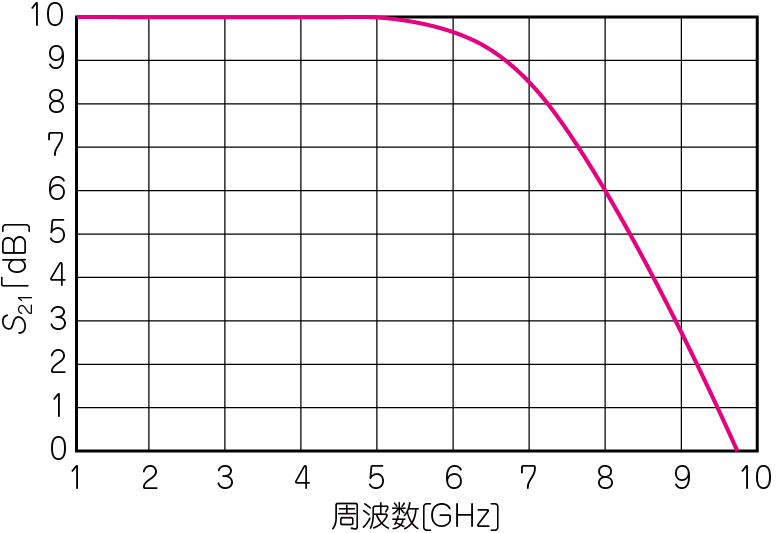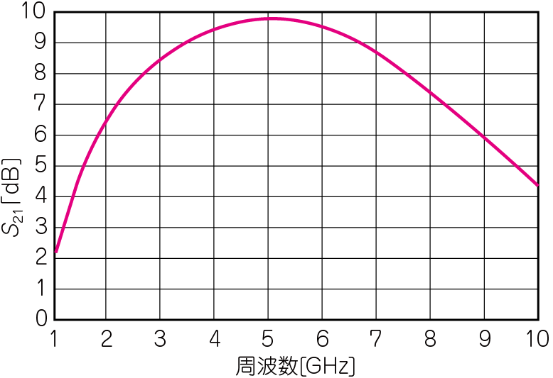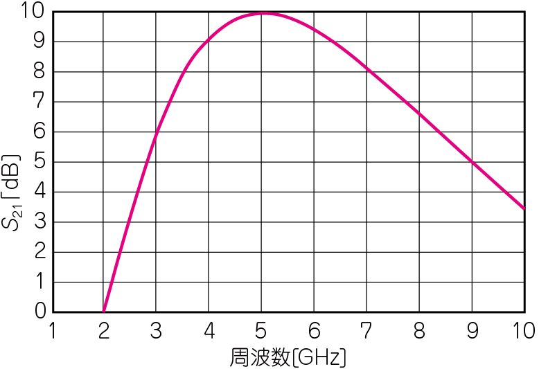 | 図6の回路では,ゲインの最大点が$5\mathrm{GHz}$のピンポイントだった |