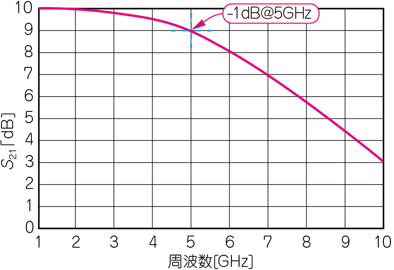 | 図3 高周波回路設計への第一歩 その②:図2の回路の$5\mathrm{GHz}$におけるゲインが$1\mathrm{dB}$に低下しているが,これをできるだけアップさせたい |