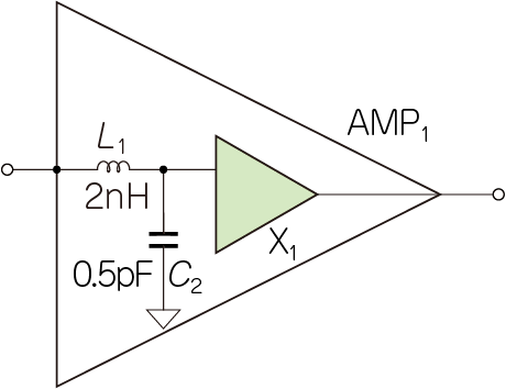 実際の$\mathrm{AMP}_1$には,入力部にインダクタ $L_1(2\mathrm{nH})$がシリーズに,$C_2=0.5 \mathrm{pF}$が並列に接続されています.リード・フレームとボンディング・ワイヤで$2\mathrm{nH}$,増幅ICのベア・チップの入力容量を$0.5 \mathrm{pF}$としています.これは,一般的なマイクロ波表面実装アンプICの入力インピーダンスを再現した構成です.
