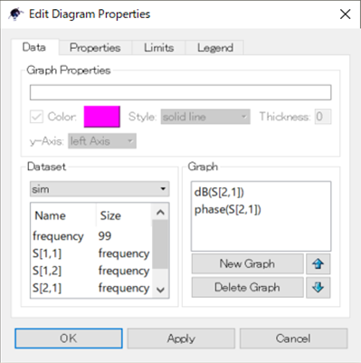図10の縦軸の設定を群遅延に変更すると,図11(a)のようなグラフが表示されます. 振幅と位相を表示させるためには,Edit Diagram Propatiesで次のように記述します.