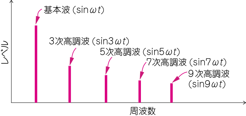 正弦波の周波数は単一です.一方,図2に示す矩形波は,周波数の異なる(奇数次)多くの一周波数の正弦波がたくさん足し合わされてできています.つまり,広い帯域にわたる信号を含んでいます.