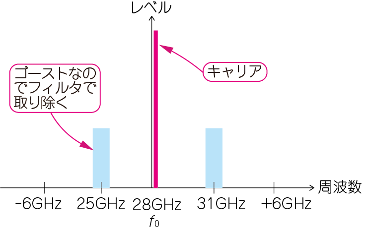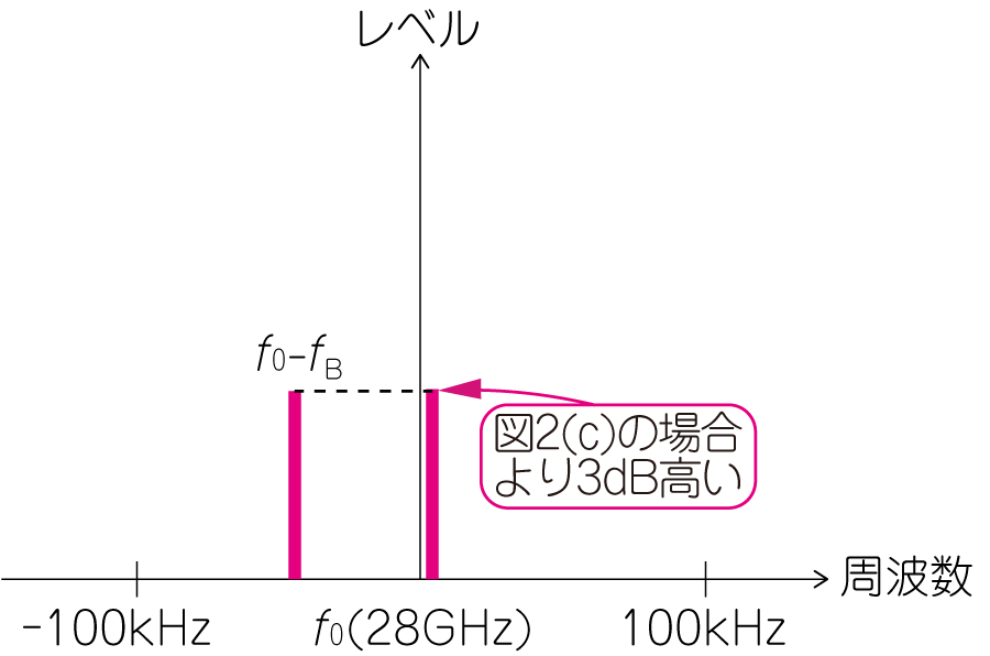 図3(b)に示すように,図3(a)のRF信号(Tx)に,28GHz($f_0$)のローカル信号を掛け合わせると,$f_0$は0Hz(ベースバンド周波数)に変換され,ベースバンド信号の周波数は0Hz(DC)をまたいで正負に現れます.