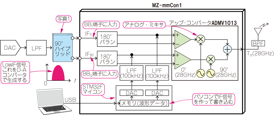 通信用データを$I/Q$変調したIF信号を用意してから28GHzキャリアと掛け合わせる