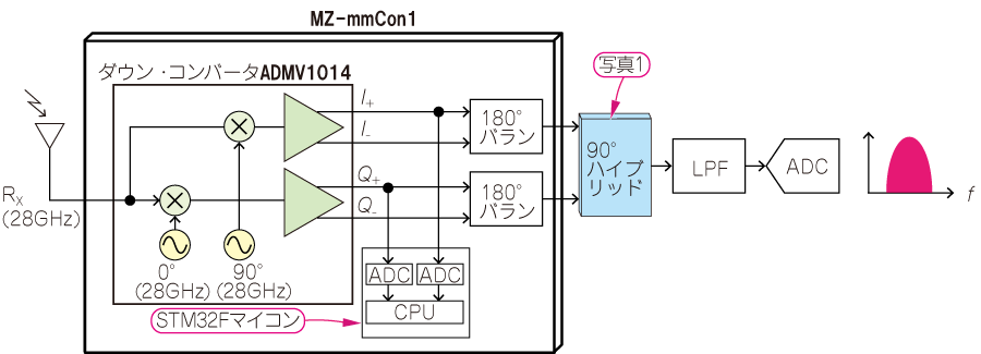$I$信号=$\sin$,$Q$信号=$\cos$と$I/Q$キャリア(28GHz)を掛け合わせて周波数アップ