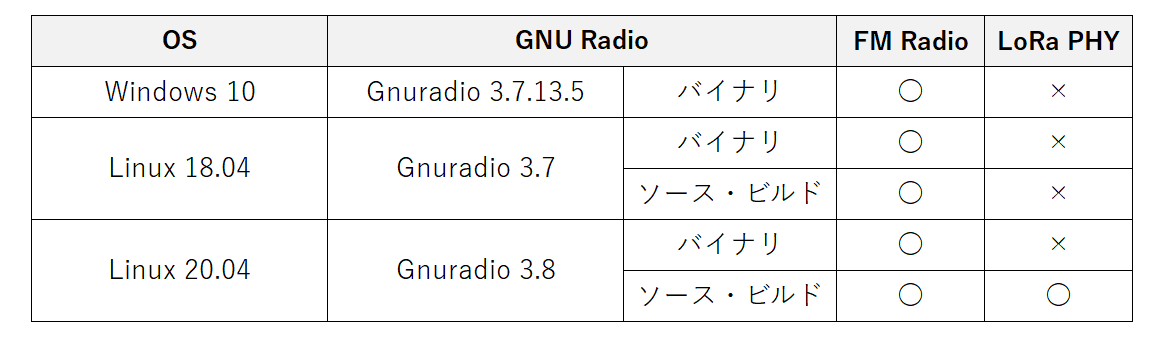 ソース・ビルドに成功するか否かは,Linux OSやGRCのバージョンやその組み合わせが影響します.以下に,LoRa PHYのインプリメンテーションに成功したLinuc OSとGRCのバージョンの組み合わせを紹介します.