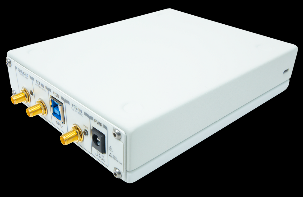 | (a)フロント・パネル(受信専用のRX2端子とTX/RX兼用のSMA端子が見える) | (b)リア・パネル(左から“GPS ANT IN端子”,“10MHz REF IN端子”,“1PPS IN のSMA端子端子”) |