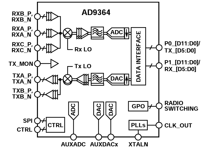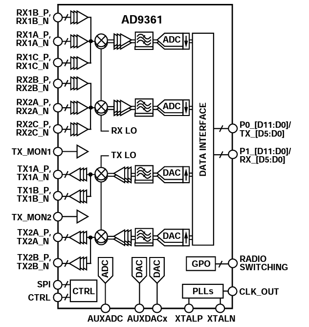 1チャネルの送信と1チャネルの受信が可能なB200には AD9364(図14)が,2チャネルの送信(TX)と2チャネルの受信(RX)が可能なB210には,AD9361(図15)が搭載されています.