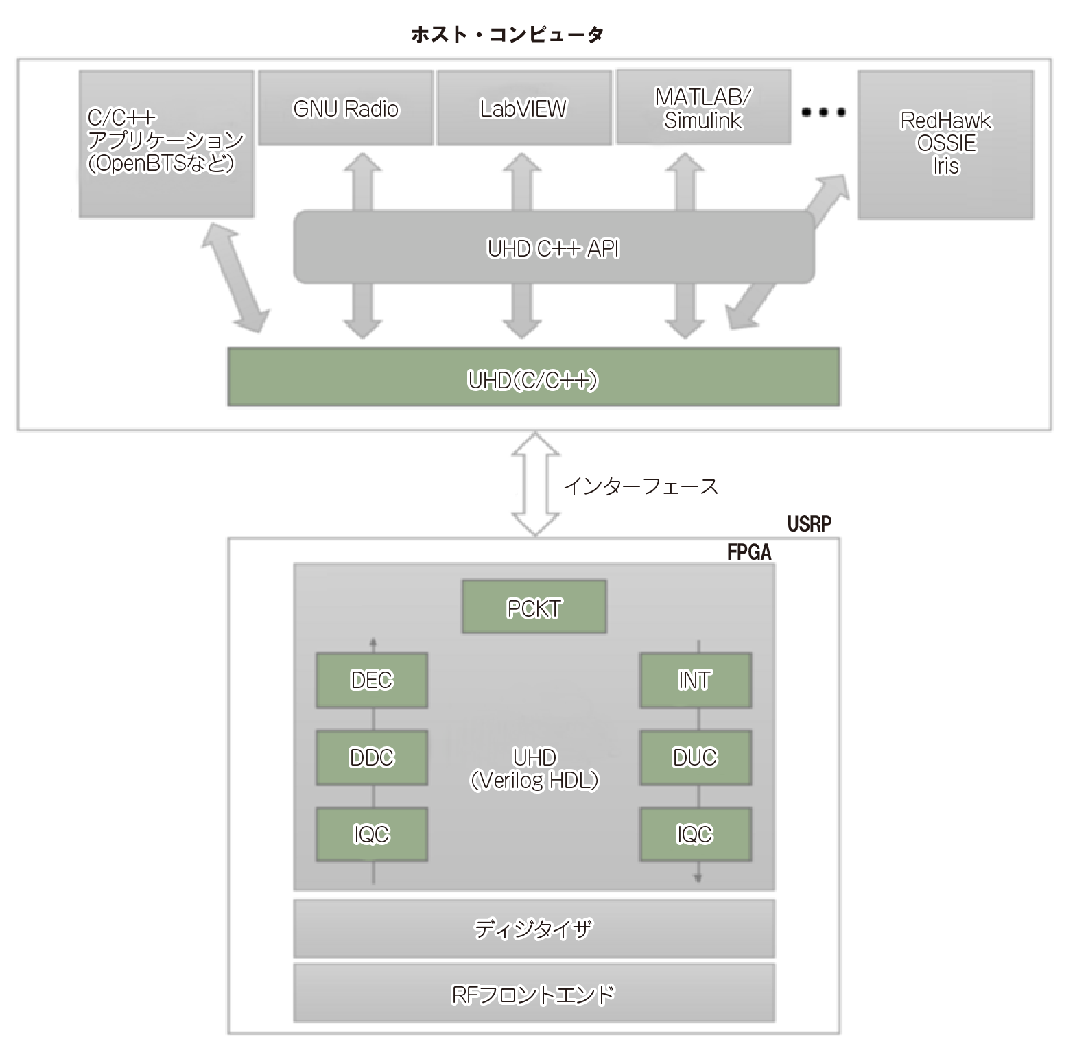 USRPのハードウェアのドライバ・ソフトウェア(以下,UHD)とソフトウェアAPIの機能は,USRPのハードウェアからホスト・コンピュータに,送受信信号(ユーザ波形)や,サンプリング・レート,中心周波数,ゲインなど,無線機のさまざまな制御パラメータの転送です.