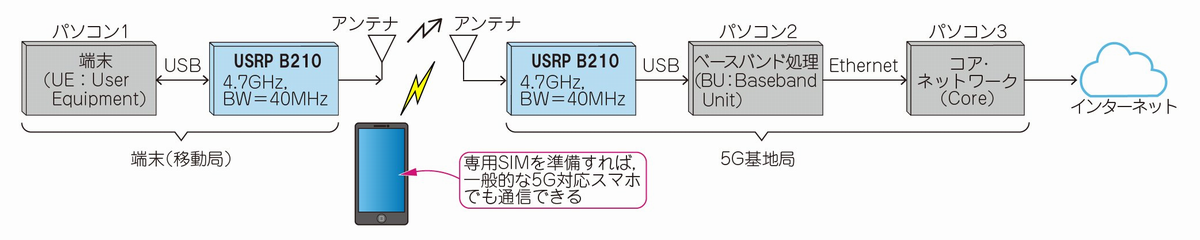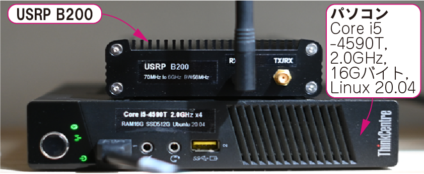 図3に示す動画は,基地局用と移動局用の2台のUSRP B210(図4)と3台のゲーミング・パソコン(Linux)を使って,5GHz帯のローカル5G通信システムを構築し,実際に動かしているようすです.実際,端末からYouTubeなどの動画を視聴することができます.