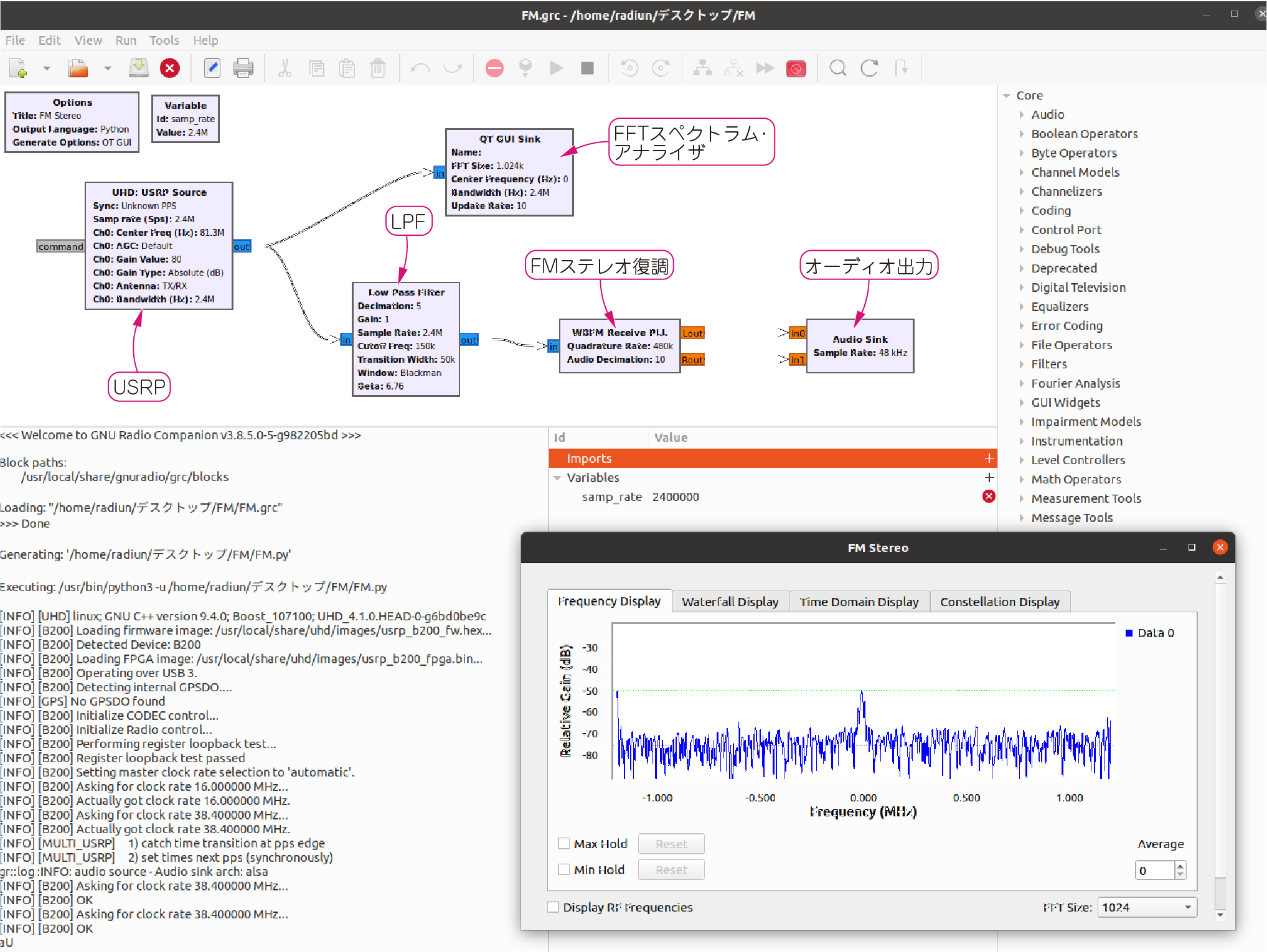 GRCには,FMラジオ以外にも地デジなどのライブラリが標準で備わっていて,呼び出すだけでソフトウェア無線機が完成します.