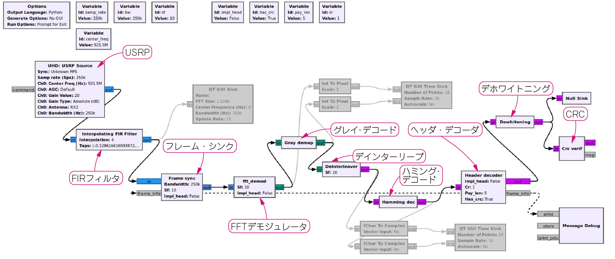 本稿では,Semtech社製のLoRaトランシーバ・モジュールで送信した電波をUSRP B210で受信し復調する処理をGRCで実現します.GRCの標準ライブラリには,LoRa無線機の信号処理ブロックはありません.