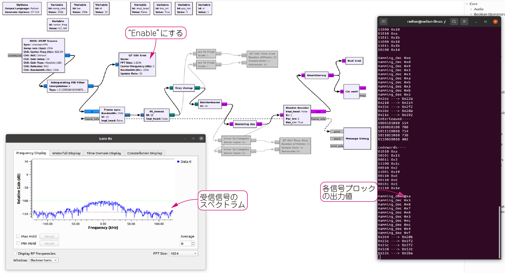 その後,受信動作が開始され,モニタ機能が有効になっていれば,画面上にそれらが表示されます.USRPのRX入力にSemteck社のLoRaチップをつないで実際のLoRa信号(921.5MHz)を入力しています.