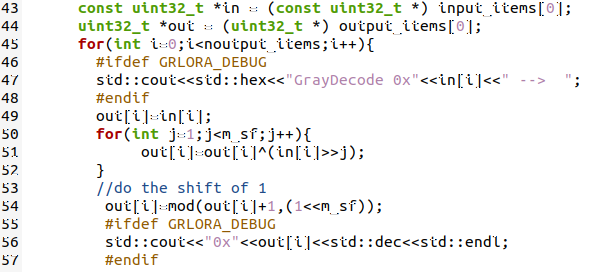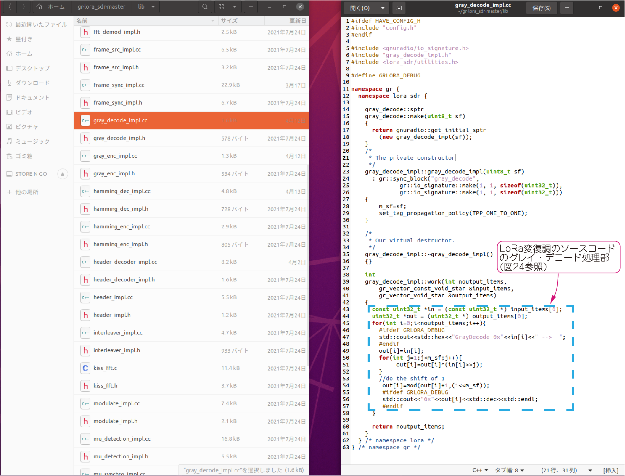 図23に示すフォルダ(gray_decode_impl.cc)にC++のソースコード(/gr-lora_sdr-master/lib/gray_decode_impl.cc)が置いてあります.これはグレイ・デコードの信号処理部分で,ソースコードの後半に信号処理の実態が記述されています(図24).