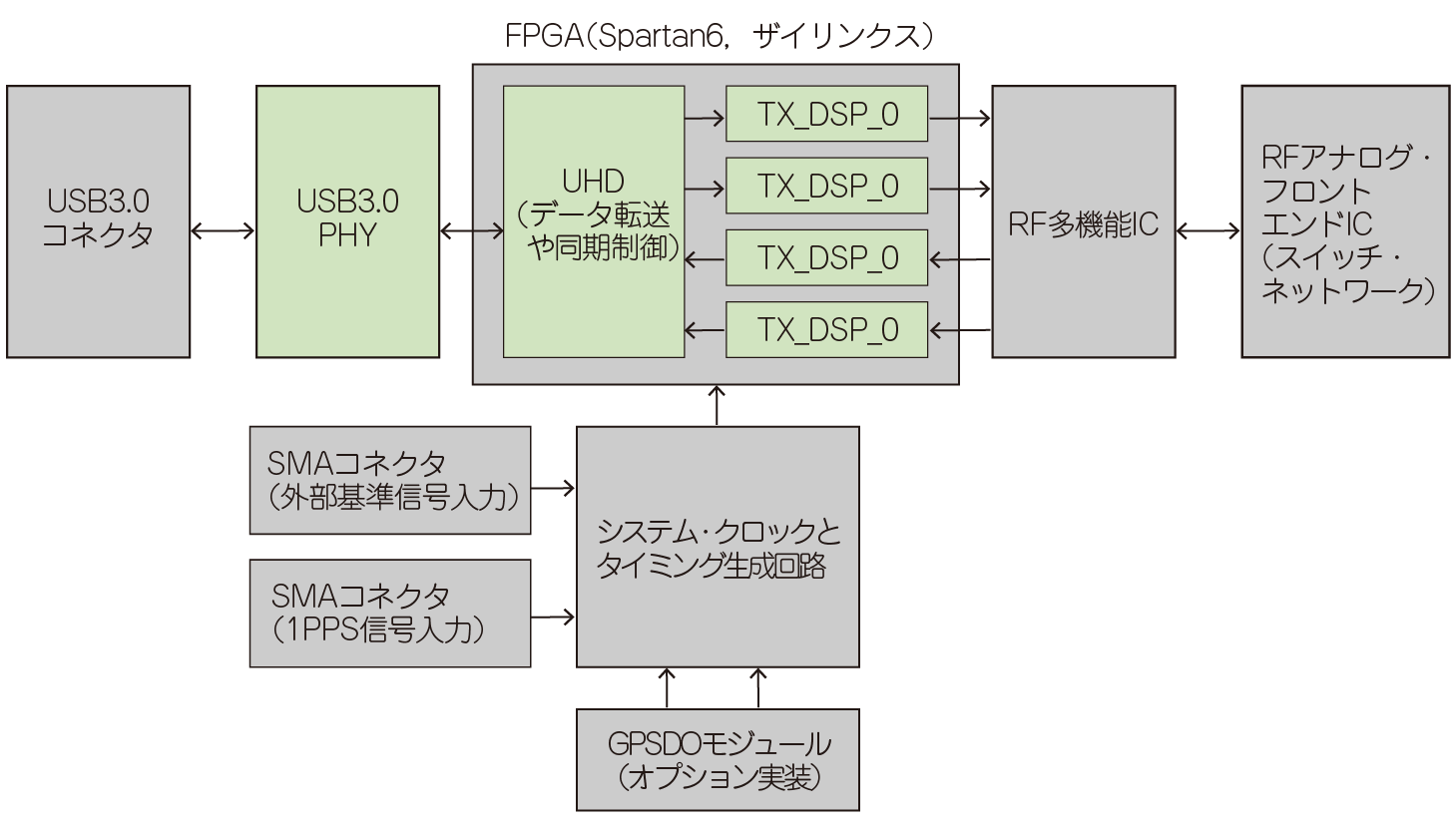 図7に,B210の回路ブロックを示します.オプションで,GPSに同期した高精度な10MHzリファレンス・モジュール(Ettus Research製,図8)を搭載できます.このボード・マウントGPSDO(GPS Disciplined Oscillator)を搭載すると,同期信号を共有していない離れた2台の無線機間で,確実に通信することが可能になります.ただし,価格(288,781円)はB210以上です.