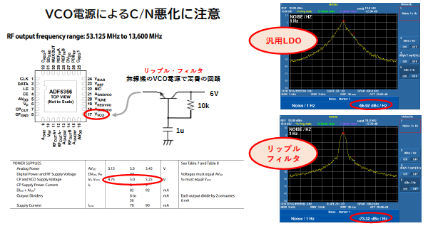 ミリ波領域におけるPLL ICのVCO(Voltage-Controlled Oscillator)の性能が,システム全体のC/N(キャリア対ノイズ比)特性を左右します.VCOに供給される電源の純度が,出力信号のスペクトラムに直接的な影響を及ぼすため,極めて重要です.ADF5356(アナログ・デバイセズ)などのPLL ICでは,VCO専用の電源入力端子が設けられており,この入力に高純度の電源を供給することで,C/N特性を大幅に向上させることが可能です.
