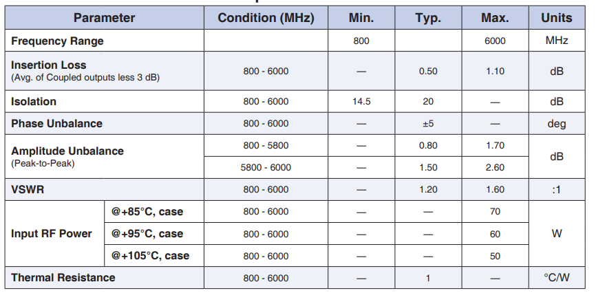 - 仕様:振幅アンバランス:0.80dB typ,位相アンバランス:±5°typ,入力最大電力:70W @+85°C,50W@+105°C,動作周波数:800M~6000MHz,基板:$t$=1.6mm,FR-4,2層
