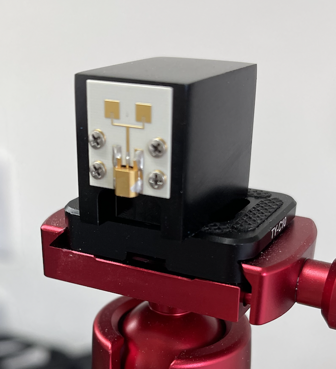 ネジ穴が付いたアルミ製の基台が付属しており,市販の一般的なムービやカメラ用の3脚スタンドに取り付けることが可能です.プリント基板材はRogers 4350B,板厚は0.254mmです.