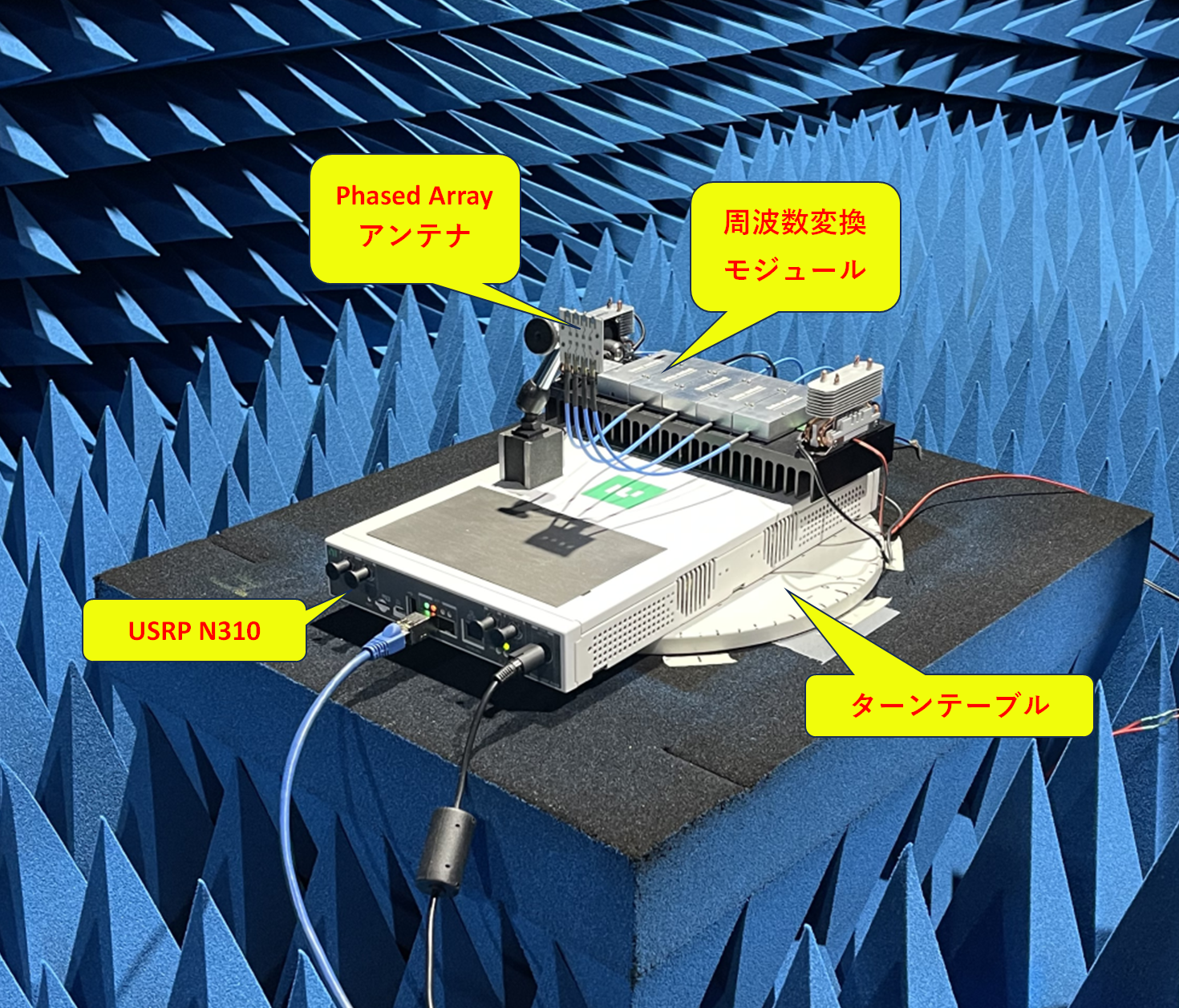 USRP N310とmmCon3をターン・テーブルに載せて回転させます.周波数が高いため,アンテナ・ケーブルは長く引き回すことができません.図4に示すように,ホーン・アンテナで受信して,ミリ波スペアナで信号レベルを測定します.伝搬距離は1.3mです.