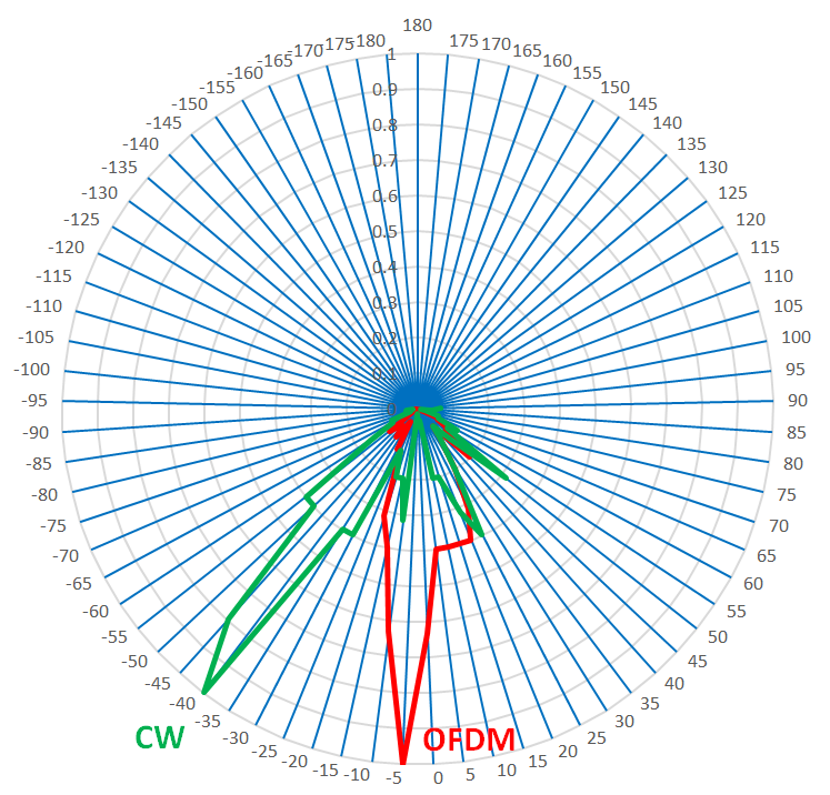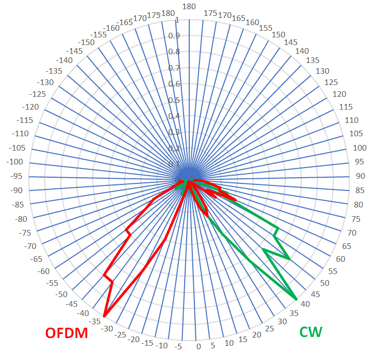ターン・テーブルの方向を変えると,OFDMとCWの信号強度が入れ替わります.黄色と紫色で角度が異なります.異なる方向にビームが放射されています.