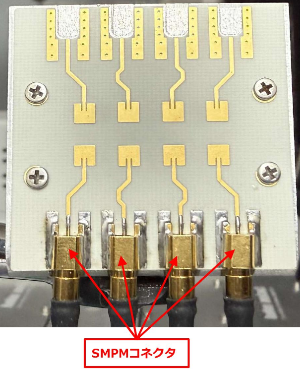 ミリ波帯のフェーズドアレイ・アンテナです.下段の4エレメントを送信用として使った例です.下側の端子はSMPMです.上段の4エレメントにも,SMPM端子を付けて出荷します.下段の4エレメントを送信用に,上段の4エレメントを受信用に使うことも可能です.8エレメントのフェーズドアレイ・アンテナとして利用することも可能です.