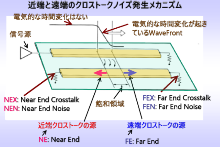 クロストークは,信号線路間の電磁的な干渉によって発生します.近端クロストーク(NEX)は主に信号源の近くで,遠端クロストーク(FEX)は信号終端付近で発生します.これらは,信号の伝播速度や線路間の結合係数に依存します.
