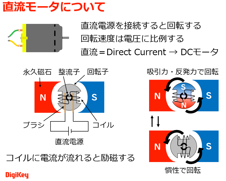 直流電圧を加えることで簡単に回転できるDCモータは,家電製品やおもちゃに幅広く利用されています.その回転速度は加えた電圧に比例します.主な構成要素は次のとおりです.