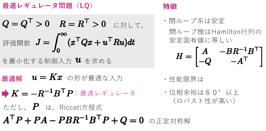 最適レギュレータ法(LQ法)は,評価関数を最小化することで最適な制御を求めます.この手法では,以下の条件が満たされます.