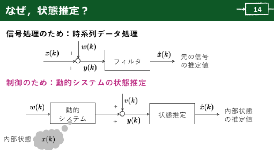 状態推定が必要になる背景には,大きく2つの目的があります.1つは信号処理の目的です.もう1つは制御の目的です.同じ状態推定でも,目的が違うと設計の考え方や評価のしかたが変わります.