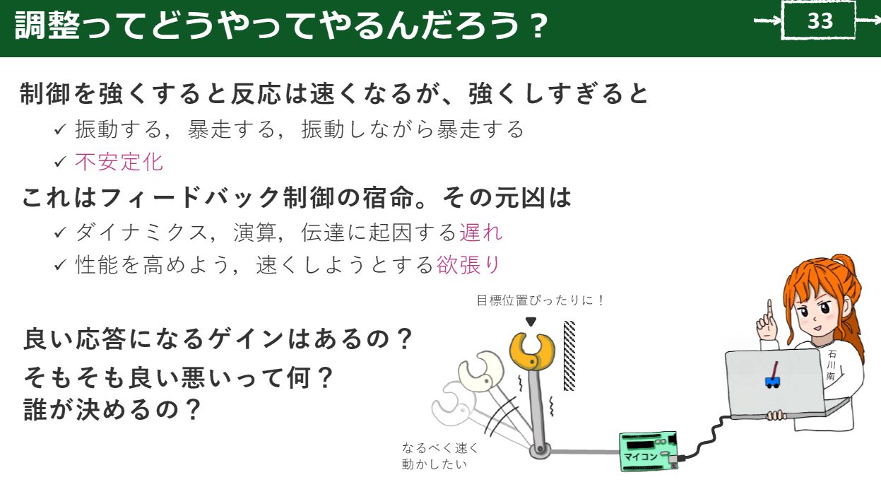 このトレードオフは,対象がもつダイナミクスや遅れに由来します.実際の装置には慣性や摩擦があり,操作を加えても状態は即座に変わりません.制御器は,こうした性質を前提に設計する必要があります.単に応答を速くしようとすると,振動や不安定さが表に出ます.