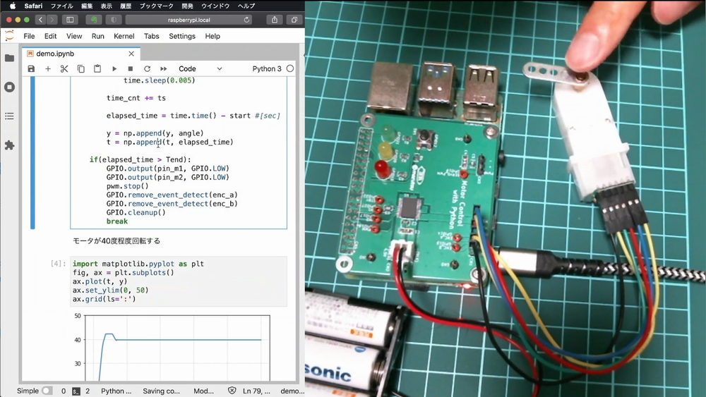 センサとアクチュエータのしくみとコンピュータのつなぎ方から,制御の基礎とモータのPID制御,モデルべースの制御器設計まで丁寧に説明します.Pythonによるモータ制御系の設計方法や実装方法を体験することができます.